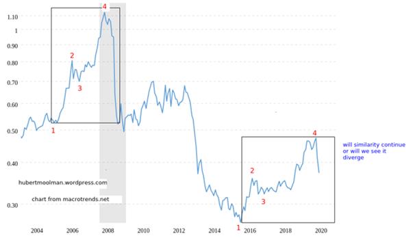 In the chart above, there are two patterns marked out (1 to 4). The current pattern appears to follow the earlier pattern. If the similarity continues, then there is a good chance that the outcome of the current crisis will be like the 2008 one.