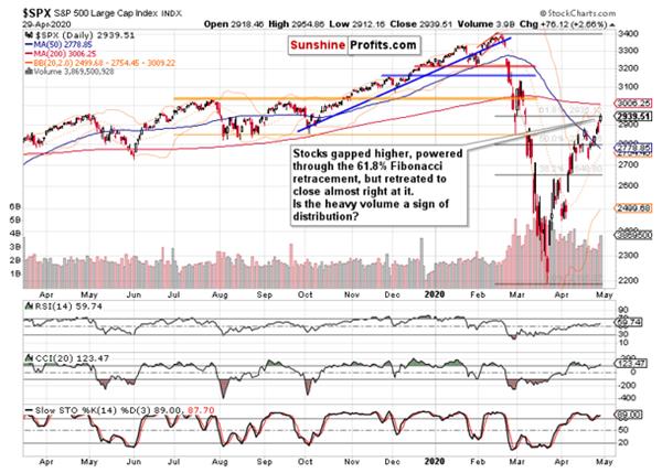 Please note that earlier in April, we’ve seen higher volume too, and stocks still made it above the key resistance (the 50% Fibonacci retracement) back then. The daily chart examination right now leans in favor of upcoming consolidation that will be followed by renewed upswing taking on the upper border of the early March bearish gap.