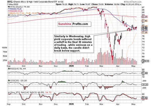 Summing up, stocks again proved resilient in the face of grim employment data yesterday. While high yield corporate bonds wavered in the final 30 minutes of trading, their outlook hasn’t been invalidated – they continue to support the stock upswing. Coupled with the sectoral performance and key ratios, it’s likely we’ll see stocks shake off today’s bad employment data, and continue their grind higher. Our open and increasingly profitable long position remains justified.