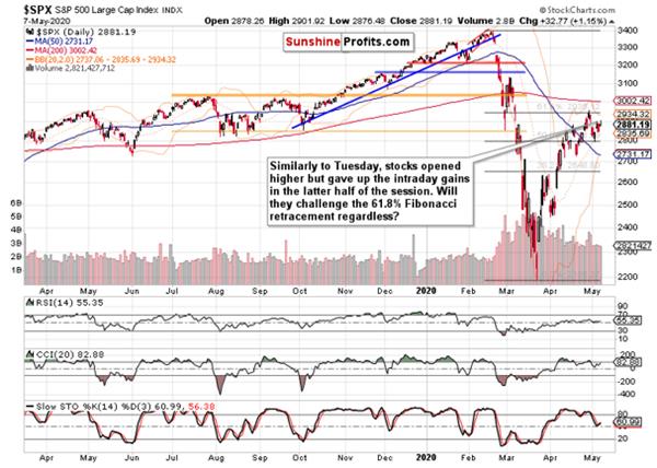 Yesterday, we’ve pointed out the many bullish signals going for stocks, and saw them open higher, and extend their gains. Well, that was true about the first half of the session, as the S&P 500 returned to trading close to unchanged before the closing bell. Is the upswing over now?