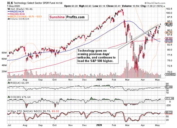 Another day, another new closing high in the tech sector (XLK ETF). Regardless of the upper knots of recent days, technology just continues to open higher the next day. While yesterday’s volume has been heavier that the days before, it would be premature to talk about a reversal. As things stand currently, technology continues to lead the S&P 500 upwards.