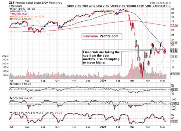 Supported by the bullish action in the HYG ETF early in the day, financials (XLF ETF) also opened with a bullish gap and extended gains. Unlike junk corporate bonds though, they haven’t given them up before the session was over, which is a bullish sign for the sector – and thanks to its ratio to utilities (XLF:XLU), also for the whole index.