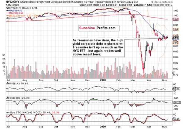 The ratio of junk corporate bonds to short-dated Treasuries (HYG:SHY) has performed slightly worse yesterday, driven by rising Treasuries across the board. Yes, not only the short-term ones (SHY ETF) went up, the same goes for long-dated ones (IEI ETF) too.