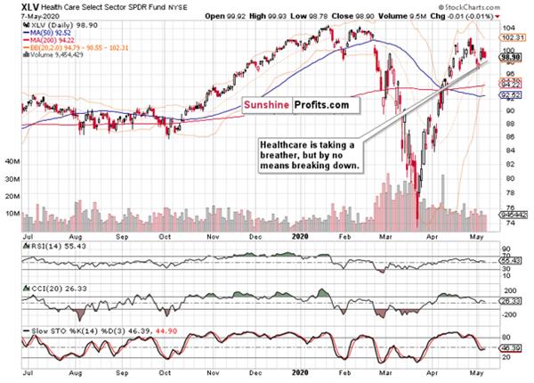 Healthcare (XLV ETF) isn’t performing as strongly, but it isn’t breaking down either. The sector appears just consolidating. Should we see higher volume with yesterday’s candle, that would be bearish – but it wasn’t there. Thus, consolidation appears to be the most probable scenario here.