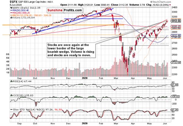 Refusing to move lower much further, stocks declined a little in response. If you look carefully at VIX, you'll see that it's been also trading in a wedge pattern – this time, in a bullish wedge. And as breaking below its lower border hasn't succeeded for two days in a row already, what does that mean? Rising volatility in all likelihood. And I think that the bears will be surprised by the prevailing directional move.