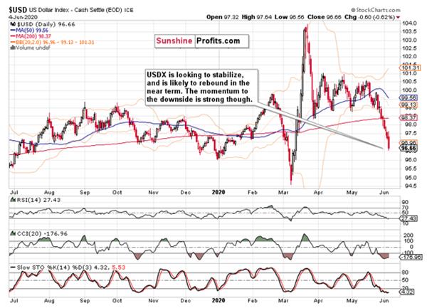 Given the strongly positive jobs data arriving (2,509K non-farm payrolls with unemployment rate decreasing to 13.3%), the dollar could have staged a rebound. The fact that it doesn't, is telling, and supports my thesis of the dollar not really rising (there aren't such deflationary pressures anymore) but rather rolling over and going sideways-to-down. This short-term dynamic means that unless the greenback makes really bullish moves, stocks won't come under significant selling pressure.