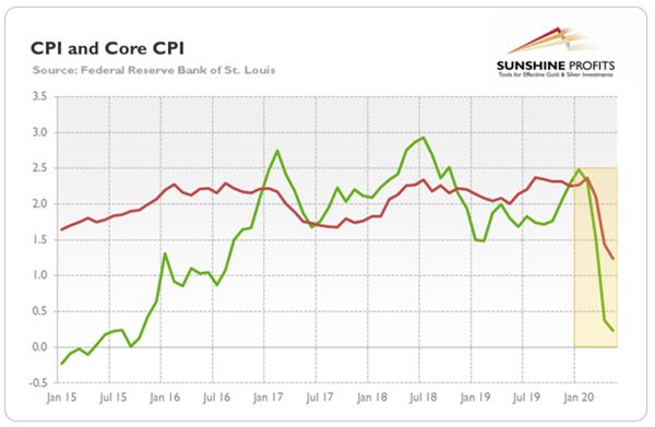 the overall CPI increased just 0.2 percent (seasonally adjusted and merely 0.1 percent without the seasonal adjustments), following 0.4 percent increase in April. It was the smallest 12-month increase since October 2015. The core CPI rose 1.2 percent over the last 12 months, compared to the 1.4 percent increase in the previous month. It was the smallest increase since March 2011. Both indices are substantially lower than a few months ago. The chart below shows these