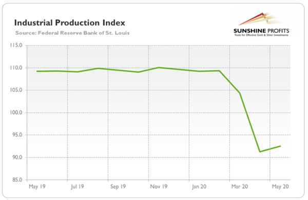 Another sign that the US economy began to revive in May, was the increase in industrial production by 1.4 percent, as many factories resumed operations. However, the number came below expectations, and the industrial production was still 15.4 percent below its pre-pandemic level, as one can see in the chart below.
