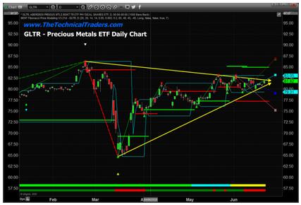 This Daily GLTR chart highlights the current FLAG formation that has setup in price and is about to breakout/breakdown. Our researchers believe the obvious breakout move to the upside is going to happen given the current global economic environment and the fact that we are looking at Q2 data within 10+ days that will likely shock many investors. Notice that our Fibonacci price modeling system has drawn UPPER GREEN and LOWER RED triggers levels well above and below the current FLAG APEX level. This adaptive p[rice modeling system attempts to track price rotation and ranges while adapting internal factoring levels to identify proper Trigger and Target levels. At this point, GLTR must move above $85 to trigger a new BULLISH TREND or below $77.50 to trigger a new BEARISH TREND.