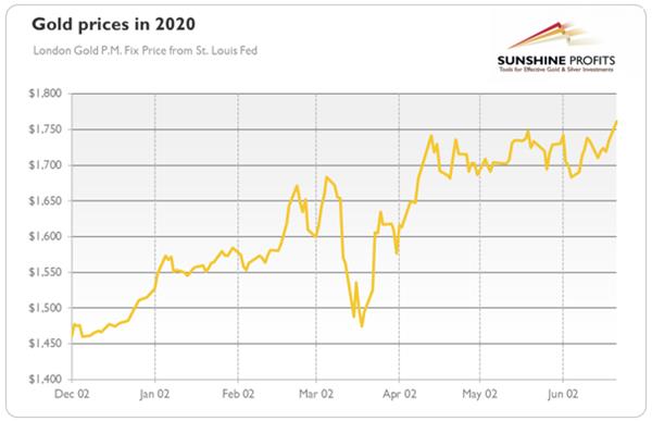 gold gained more than 16 percent, rising from $1,515 at the end of December 2019 to $1,762 at the end of June 2020.