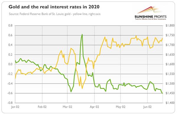 which should support the gold prices. The record low was -0.87 percent, so there is still some potential for going negative, especially given the ultra dovish Fed’s monetary policy.