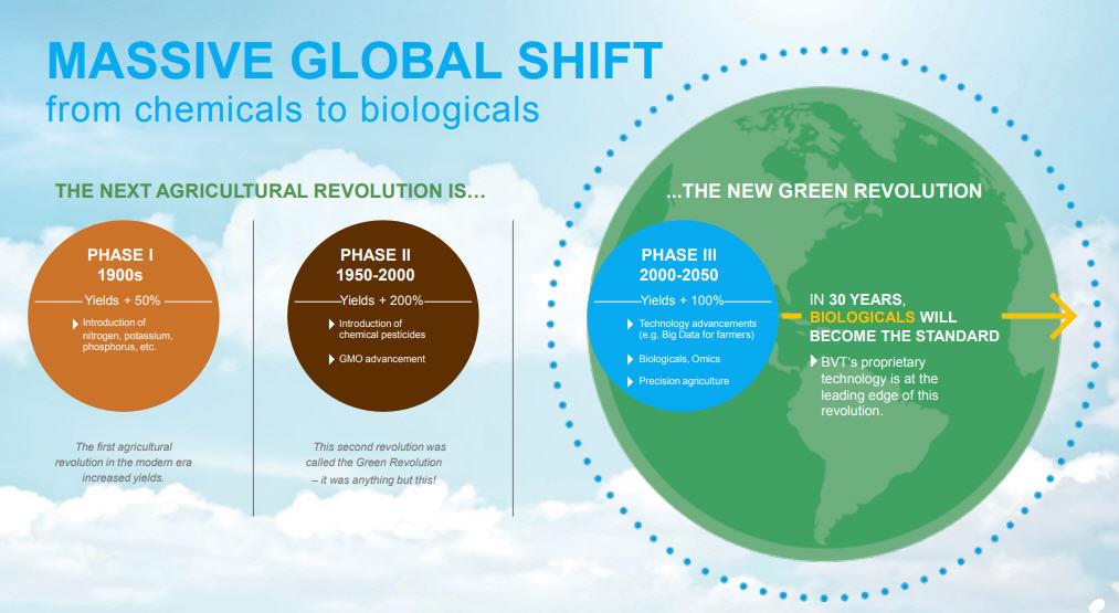 BVT is improving agricultural productivity in a way that uses less water and isn't harmful to soil, bees, animals or people. This is our unique position in the marketplace: we are the world's only natural precision agriculture company, and we're poised to lead the new green revolution and the food system transformation that are so vital to our survival in the coming years.