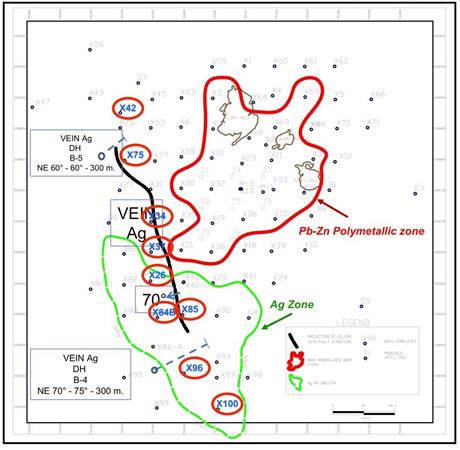 (Location of the drill holes in the High-Grade Silver zone to the SW of Bilbao. Image via Xtierra Inc. Click to enlarge.)