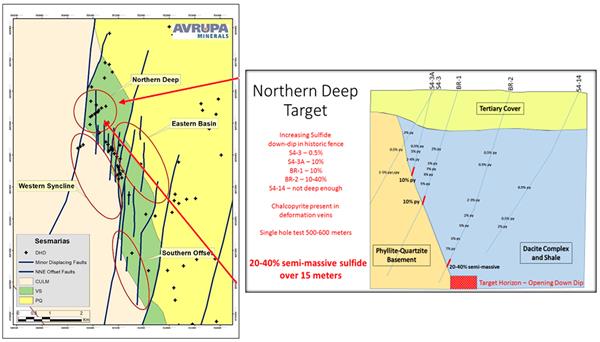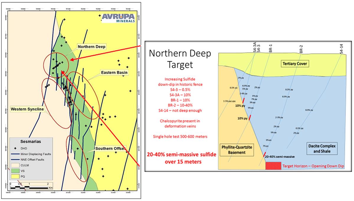 To date, the Company has completed two drill holes and started a third one in the SES008 area at the north end of the known Sesmarias massive sulfide mineralization zone (pictured above). In 2014, Avrupa discovered massive sulfide mineralization at Sesmarias and since then, intermittent drilling increased the known strike length of the massive lenses to 1.6 kilometers.